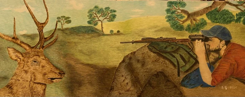 Dessin fantastique et portrait d'un chasseur sur contreplaqué avec pyrogravure et couleurs Caran d'Ache Luminance