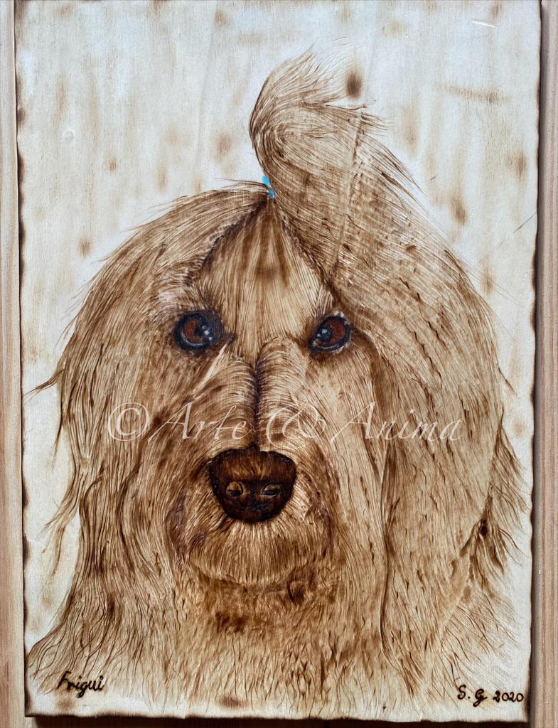 Portrait Fregui sur contreplaqué A4 aux couleurs pyrogravure «occhI» Caran d'Ache Luminance